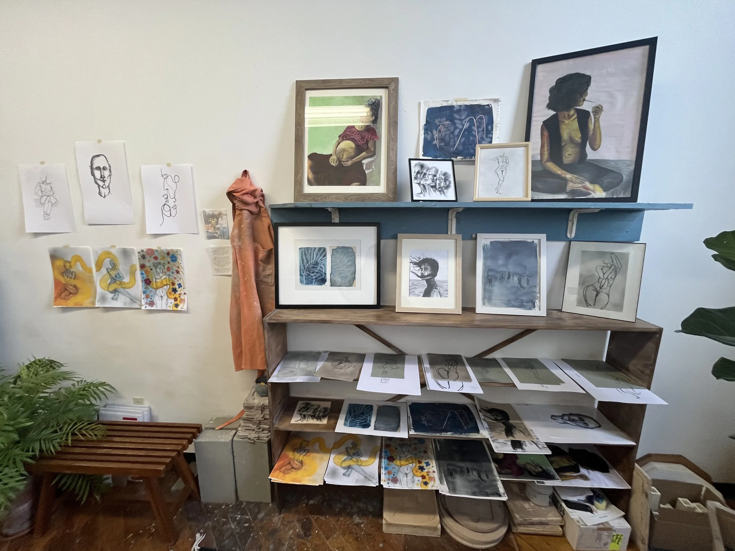 In art, she plays with different mediums, but lately has been drawn to the simplicity of single-line drawings. Her other work includes ink+paint+cyanotype and charcoal+acrylic paint.